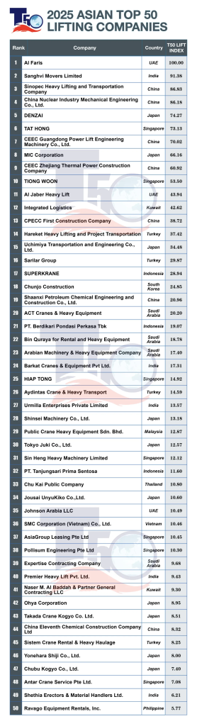 2025亚洲吊装50强榜单根据T50吊装指数(T50 Lift Index)进行排序,是对亚洲50家最具设备实力和经营实力的吊装企业综合实力的排名。上榜企业来自亚洲14个国家和地区,其中,日本企业入榜数量最多,为10家;中国有7家企业入榜;此外,新加坡企业7家、印度企业5家、土耳其企业4家、阿联酋企业4家、沙特企业4家、印尼企业3家、科威特企业2家,马来西亚、菲律宾、韩国、泰国和越南各1家企业入围。跻身2025亚洲吊装50强榜单的7家中国吊装企业,分别为中石化重型起重运输工程有限责任公司、中核机械工程有限公司、中国石油天然气第一建设有限公司、中国能源建设集团浙江火电建设有限公司、中国能源建设集团广东火电力特工程机械有限公司、陕西化建工程有限责任公司、中国化学工程第十一建设有限公司。这7家企业在中国尤其是“一带一路”沿线国家的工程建设中主动布局,积极行动,不仅为亚洲基础设施建设做出了积极的贡献,更着力塑造了走向世界的“中国建造”品牌形象。T50峰会组委会宣布,“2026年亚洲吊装50强”榜单申报正式启动,欢迎企业自主申报与推荐。